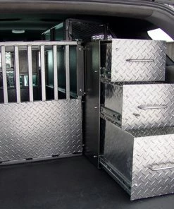 Our 3 Drawer Locking Storage Cabinet is a great place to store your gear inside your vehicle or out. The upper 2 drawers are 8″ deep while the bottom drawer is 12″ to store larger items. All 3 drawers have a chrome interior so you can more easily see what is inside during low-light situations. The outside is completed with a beautiful black/silver vein durable powder coat finish that matches our K9 Plus Transport inserts and all our powder coated crates.