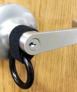 These plastic rings attach to an object with their one-wrap Velcro tape. The one-wrap Velcro is stitched securely to the ring. These rings can be used with the Open Task Carabiner or by themselves. The rings work well on items such as a lever door handle. This ring will help the carabiner from slipping off the lever door handle which is an open end style door handle. It can be used on many items as an additional aid to the Open Task Training Carabiner. Having a set of 5 rings will be convenient as you can leave the rings attached and in place where the dog frequently opens doors or drawers. It will make opening quicker as you don’t need to loop the Velcro around the item first, just snap the carabiner on the ring when needed.Â