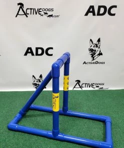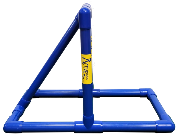 These side ramps are designed with a wider box shape base for steadiness. They are stand alone with cross beam construction which give them strength and solidity. They come with mounting brackets or they can simply be slide tight into position under the side ramp of the agility walk. These tiny work horses are an added advantage to help alleviate bounce in the side ramps. The color is blue with yellow paw print wrap.