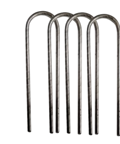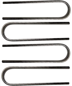 These are no wimpy thin stakes. Made from thick ¼” cold rolled steel with a clear coating on them. They area a full U-loop style stake and measure 8” long. They will fit a pipe or bar up to 1.5” wide. The stake ends are mitered so they are easy to get started into the ground.