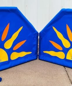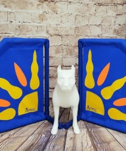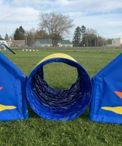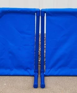 The Free-Standing Starburst Wing frame poles are 1.25” O.D. The UV outdoor fabric panels have a large bright yellow & orange starburst design in the center of the blue fabric. The backs are a solid blue color so you can use the wings either direction. These are great wings that can be used on a variety of jumps and obstacles. They are stable, sturdy, and are significant in size. They can be clearly seen by dog and handler. Because of the design they are very easy to use and can be placed in a range of ways and positions. They will not be in the way of the jump base feet and can be set close to the openings of many obstacles.