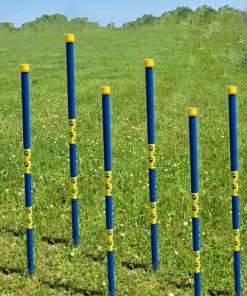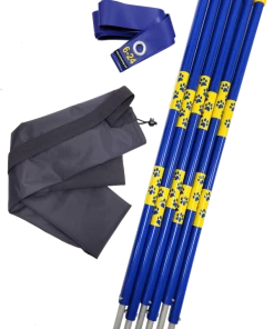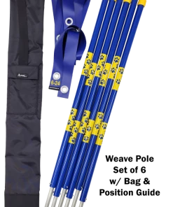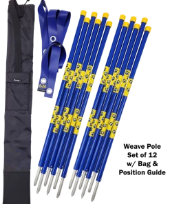 The sets comes in a convenient reinforced bottom carry bag w/shoulder strap and a vinyl pole position guide. The pole position guide has the grommets spaced 24” apart and is made from blue pvc outdoor vinyl material. The pole guide is a very nice feature so you do not have to bring a tape measure to the training field to set up the poles. Just place the posts into the grommet holes, pound them in, and they will be positioned evenly apart. (Never use a metal hammer on any pvc product).