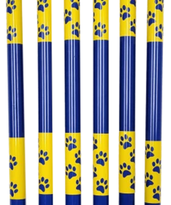 One word describes these weaver poles, and that word is “Substantial”. Most in-ground weaver poles are not that great but the Activedogs.com Agility In-Ground Weaver Poles are the exception. They are very sturdy and well built. These poles are attractively done. They are wrapped in yellow paw print wraps; the vinyl wraps are placed at 10” and 20” above ground. So, there is no taping to be done on the poles when you receive them. The top pvc caps are yellow, the wraps are yellow, the poles are royal blue. The in-ground posts are 5/8” thick and made from no rust aluminum. The posts are bolted all the way through the poles.