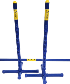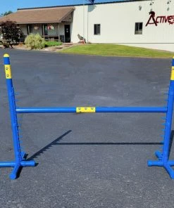 The Activedogs.com Pedestal Jump is part of the “Premium Series” line of agility equipment. It measures 36” tall. The Pedestal Jump frame poles are 1.25” O.D. This jump is stable because it has 4 feet at its bottom. The pedestal jump frame is blue with yellow vinyl wraps on the upright poles and on the jump bar. There is no tape on the jump and comes already wrapped for you. You can choose from a jump bar of 48” or 60” wide. The displaceable jump bar can be set from 4” to 26” in height.