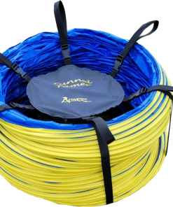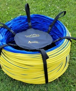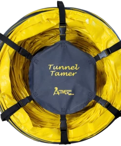 The Activedogs.com Agility Tunnel Tamer is just that. These large 4” pitch tunnels are heavy and unruly to put away and move around. The Activedogs.com 20’ tunnel weights over 60 pounds. The tunnel tamer is a life saver and is so easy to use. It is constructed of six heavy duty poly straps. Poly is a better material for outdoor use as it will not rot as fast as nylon. Because each strap has a looped handle two people can carry that big tunnel. The tunnel tamer is very easy to put on and take off.