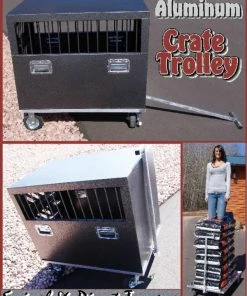 The Aluminum Crate Trolley floor is made from solid tread-brite aluminum, giving it a non-slip surface. The floor has a welded lip-edge to prevent crates from sliding off the cart. The trolley has a swivel & pivot tongue for easy maneuvering. The T-shaped handle is removable and retracts under the cart for storage. The trolley’s lightweight aluminum construction and pneumatic tires makes this cart easy to pull. The crate trolley has come in handy when we have had to move dogs in crates through the airport. We also use these crate trollies on our training field to move around field and agility equipment.
