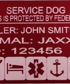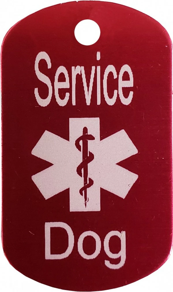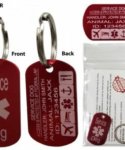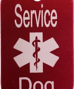 This is a high quality laser engraved aluminum Service Dog & Handler Registered ID Tag for people with a Service Dog. This aluminum dog tag is .75” x 1.5” in size and is available in red. The tag comes with split ring and is a perfect size tag for working service dogs. It can also be worn on a bracelet or lanyard. Styles: Service Dog: The front of the tag is engraved with Service Dog & the Medical Alert Symbol on it. The Back of the tag is laser engraved with Service Dog Access Required by Federal Law then the Handler & Dogs Name followed by the ID number. Size is .75” x 1.5” .050″ Thick Color: Red Comes with 3/4″ split key ring.
