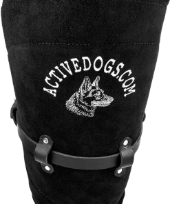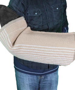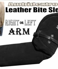 Our Ambidextrous Bite Sleeve has a sleeve and base that is constructed of heavy, suede leather. The leather cuff is comfortable and can be worn on either arm.