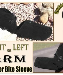 Our Ambidextrous Bite Sleeve has a sleeve and base that is constructed of heavy, suede leather. The leather cuff is comfortable and can be worn on either arm.