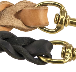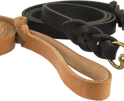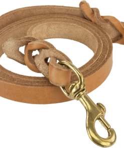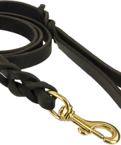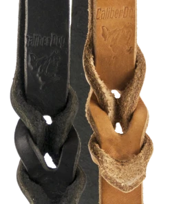 The CaliberDog Leash is hand crafted using top quality leather and solid brass hardware. This unique leash is constructed without stitching or rivets, giving it superior strength. It is made by braiding the leather to create the 8” handle and attach the bolt snap end. This design also allows for the bolt snap to be connected to the handle, making it easy to carry the leash over your shoulder. The leash is 3/4″ wide and 5 ½’ in length and comes in either black latigo leather or tan harness leather.