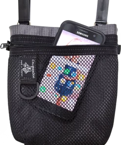 The CaliberDog Bait Bag is the best of all bait bag designs because of its many features. It is built with CaliberDog materials so it is built to last. It has several features: The front of the bag has a mesh pocket so your cell phone can be easily seen and heard when it rings. Because the mesh pocket zips you don’t have to worry about losing your phone when running. If you use head phones then the headphone cord can slip out the top of the zipper, leaving the phone secured in the pocket. There is a black D-ring on the bag front for clipping poop bags, keys, etc. There are two interior pockets. The second interior pocket has a hook & loop top closure. The front contoured pocket is vinyl lined with water resistant materials so it is very easy to clean out. The back outside of the CaliberDog Bait Bag has a small zipper pocket perfect sized for cash and cards. The exterior of this bag is made from the CaliberDog ripstop gray materials. This bag has double wall construction.