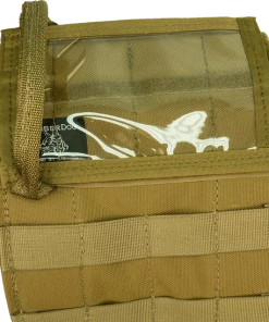 This MOLLE Window ID Pocket was designed to be used with the K9 Tactical MOLLE Vest and attaches to the vest in two ways. Â It can be used on the sides of the vest or on the vest top back. Â On the back of the Window ID Pocket are MOLLE straps and hook and loop. Â You can attach the Window ID Pocket on the top of the vest back with the hook and loop or use webbed MOLLE sticks to attach the Window ID Pocket to the vest sides. Â Webbed MOLLE sticks are sold separately. Â This Window ID Pocket is large enough to hold any of our patches and can hold two of the smaller patches. Â Inside the Window ID Pocket is a coordinating hook and loop strip so if you are purchasing the patches with hook and loop backs they will stay straight inside the vinyl pocket. Â The full side length of the window pocket opens for easy loading of your ID, paper work, or patches. Â The full top of the window pocket is clear heavy gauge vinyl and 1000 denier Cordura is used on the back of the window pocket. USA MADEÂ Â