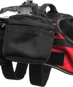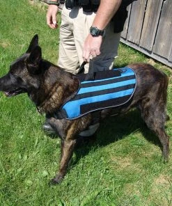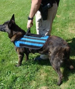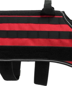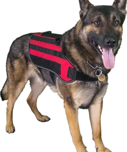 There is a row of 2″ hook and loop, and 2 rows of 1″ MOLLE straps on each side of the vest so accessories can be used with it. ID panels or patches can be attached to the top hook and loop or the side hook and loop of this vest. The vest has double girth straps and a chest strap so it will fit securely on the dog. The adjustable chest/neck strap sits above the dog’s breast bone eliminating any gap at the neck area of the vest. The lay-flat handle can be stuck down to the hook and loop when it’s not needed.