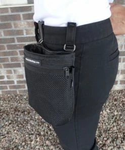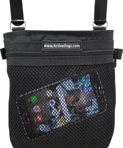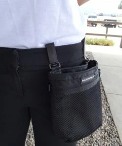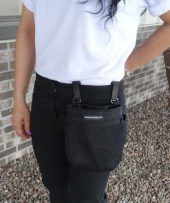 The Clip-On Bait & Phone Bag is designed to be used with pants that do not have belt loops. I use my Belt Loop Bait Bag nearly every day. The issue arises when I wear pants that do not have belt loops on the pants, like leggings. So I invented this handy bag that simply clips onto the pants waist band. I also generally have my cell phone with me and that gets messy in with my bait. On the Clip-On Bait & Phone Bag there is a zipper front mesh pocket so the phone can be easily seen and heard when it rings. Because the mesh pocket zips you don’t have to worry about losing your phone when running. If you use head phones then the headphone cord can slip out the top of the zipper, leaving the phone secured in the pocket. Like our Belt Loop Bait Bag this bag can be worn in the front, back or sides of your pants waistband. This bag constructed with a double layer construction. The interior is made from a water resistant vinyl so it is very easy to wash out, making clean up a snap. The exterior is made of Cordura fabric and the heavy mesh pocket is on the bag front. This bag is black in color and MADE IN USA.