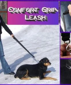 The Comfort Grip Traffic Leash is made with 1 inch wide, heavyweight, black tubular nylon webbing. The contoured, rubber handle provides a wide, comfortable grip. A heavy D-ring has been placed about a foot above the snap and allows you to loop the leash back to itself. The leash attaches to your dog’s collar with a Herm Sprenger Swivel Scissor Snap, which easily pinches open. The leash forms a Y style shape, giving you better control of your dog. This comfort grip leash is perfect for an individual with an arthritic hand, or someone who needs a more secure grip when walking a dog. Made in USA.