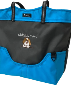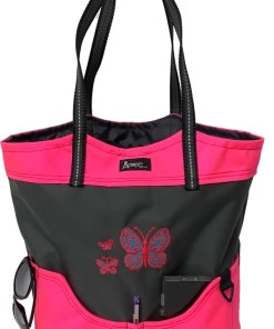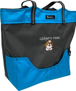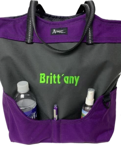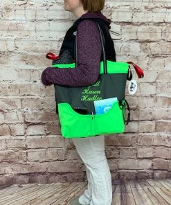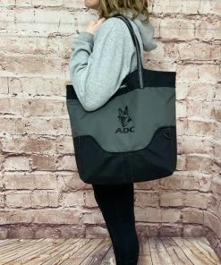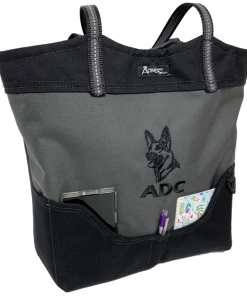 You can fit so much in this size tote. It is large 16” tall, 14” wide and 6” deep. The handles are long enough to comfortably fit over your shoulder. The handles are made from a no-slip rubberized webbing, with an added reflective tape running through them. This exclusive stunning tote bag is tastefully done in gray and accent color.
