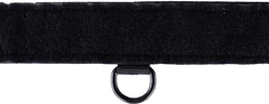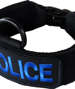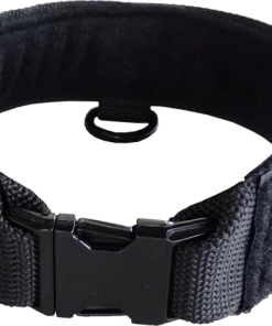 This dog collar has all metal hardware. The black, contoured side release metal buckle is sized smaller than the 2” collar. There is a welded, black metal D-ring attached to the top of the collar for easy leash attachment.