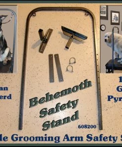 After having my grooming table broken three times from dogs that were very large or overly aggressive, I developed our Double Grooming Arm Safety Stand. The purpose of this stand is to keep the dog safely on the table and free up both hands and arms of the groomer to work on the dog. It takes much longer to groom a dog when constantly having to grab the loop restraint or, hold the dog in place.