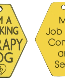 Therapy Dog tag is an elongated diamond shaped tag made from yellow acrylic with black engraved lettering. “I AM A WORKING THERAPY DOG” is on the front, and “MY JOB IS TO COMFORT & SERVE” is on the back. Includes a split key ring.