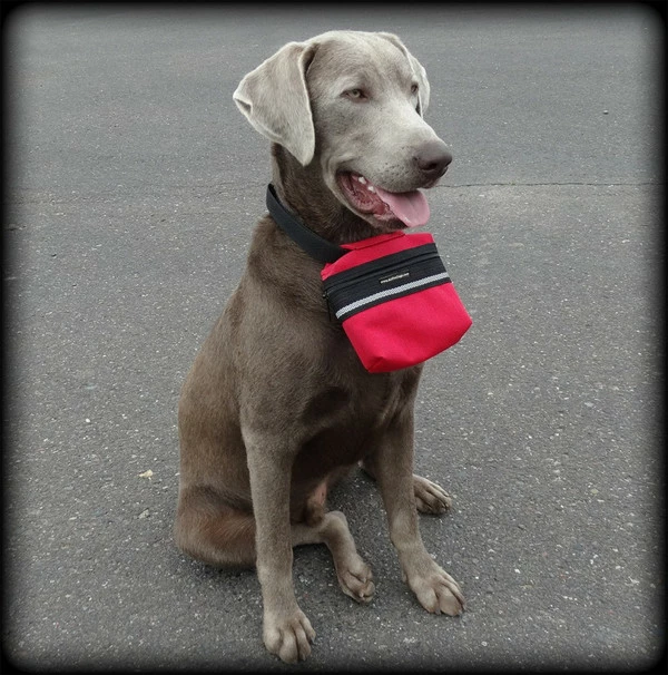 Our Dog Collar Pouch is made from 1000 denier nylon/urethane coated fabric. It has a zipper that opens around 3 sides for easy access. As an added safety feature, there is a reflective strip that also runs around 3 sides. The bag slips through the dog’s collar and moves freely.