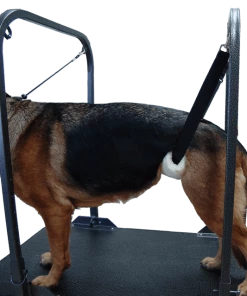 Wonderful tool to aid in grooming dogs that don’t stand well on the grooming table. It is not uncommon for older dogs to have a hard time to stay standing for the entire groom. And puppies like to squirm around on the table while grooming so we have solved this problem by developing our Under Belly Support. The great thing about this support is that it is not in the way when the dog is loading onto the table. The dog does not need to step over it and you do not need to clamp it down on the table to use it. The Under Belly Support has an adjustable length to accommodate any size dog. Very simple to use, after the dog is on the table then you just slip it under the dogs belly and attach one snap end to your groom arm then adjust it to the length desired and then attach the other snap to the groom arm. Now the dog is in position and no twisting and turning around so your groom will go faster and be safer. The Under Belly Support comes with a thick Sherpa comfortable pad for the dogs under belly flank area to rest on. The Sherpa pad is Hook and Loop closing so it can easily be removed for washing. It is machine washable which is sanitary and convenient. The Under Belly Support will work with a single grooming arm or our Double Grooming Arm Safety Stand. Made in the USA