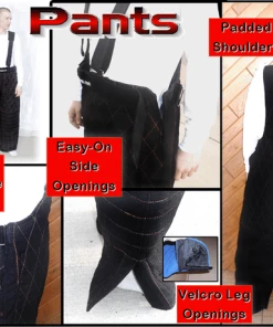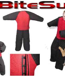 This is a medium/heavy weight suit, our Heavy Bite Suit is made from a combination of aerotex and french linen fabrics (bite Suit Material). The suit is padded to provide good protection. This suit is easy to get off and on. The jacket has hidden front closures; stand up collar and long arms to help protect your hands. The back of the jacket is cut slightly longer than the front to give you extra protection. The pants have padded shoulder straps for comfort. Open waist sides and leg bottoms for easy access. The waist of the pants is adjustable on each side of the pants waist. You will not find another suit of this quality construction for this price. Made in the USA. Bite Suit Material is a gray/blackish color and the Aerotex is a red color.