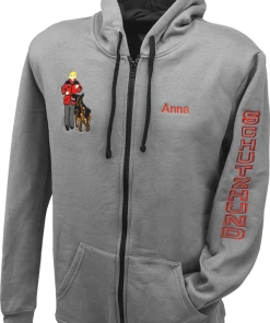 The Embroidered Schutzhund Hoodie is a heavyweight (7.8oz.) 50/50 cotton/polyester blend that is pre shrunk. This hoodie is made for warmth with out being bulky, It is a zip-up style hooded sweatshirt. The four sizes (M-L-XL-2XL) come in black, blue, red, or gray. Black draw string, hoodie lining, and zipper on all colors.