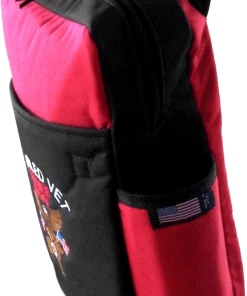 The front pocket panel comes with a variety of embroidery choices that are beautifully done in high stitch count embroidery work. This bag comes color blocked in two colors they are black with your color choice combination. Size is: 15” tall x 12” wide x 4” deep. Personalization of up to 20 characters centered on the red above the black pocket (Text will be block font).