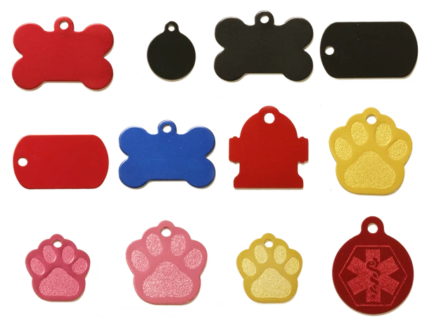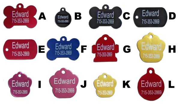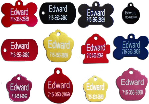 The Engraved Aluminum Collar Tag is engraved on both sides. The tag comes in several color and style choices. The corners of the tag are rounded, so they will not poke the dog’s neck when it is lying down.