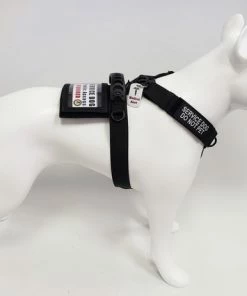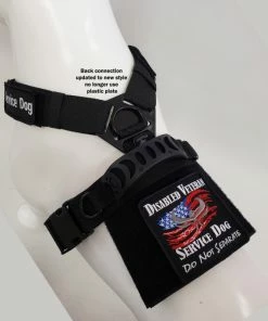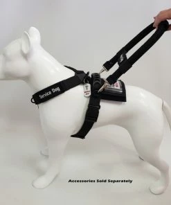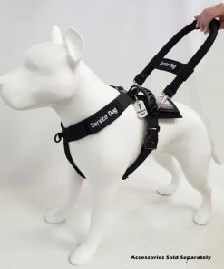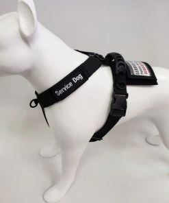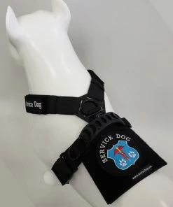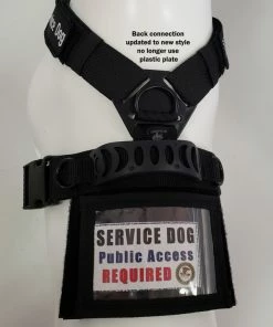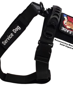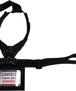 The No-Pull Service Dog Strap Harness has a great range of adjust-ability. Both the chest straps, underbelly strap, and the girth strap is adjustable. There are no loose floppy straps on the No-Pull Service Dog Strap Harness. It comes with two Service Dog patches that are Velcro backed so they can be changed out. The entire back plate is also Velcro so patches or an ID pocket window accessory can be added, (sold separately). The handle is a raised molded easy grip handle with two D-rings. The D-rings on the sides of the handle can work to attach an extended bridge handle, (sold separately). This harness is black in color and is offered in two sizes. Girth size for M/L harness is 22” to 32” and the size XL harness will fit a girth from 29” to 44”. Bridge handles, custom patches, ID window pocket, and ID cards are sold separately.