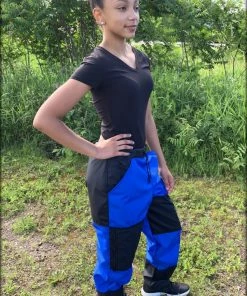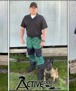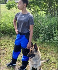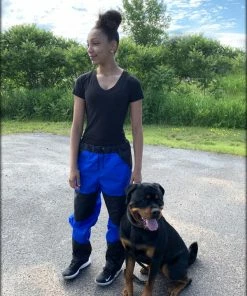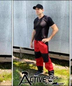 These handler pants are made from soft durable wind and water-resistant nylon fabric. The color blocked handler pants come in the same matching colors that are offered in the activedogs.com Warm Weather Handler Vest and Trainers Choice Handler Vest. The pockets, waistband, rear, and lower leg guards are done in black fabric and the pant legs are done in the color choice. All seams are double stitched and finished. These pants have 5 pockets. There are two front leg thigh pockets with side zipper openings, two deep trouser pockets, one with inside card pocket. These pants are easy to slip on with an elastic waistband. The waistband is an elastic self-adjusting waist band with tie able drawcord. The rear seat area of the pants is two layers of fabric. That makes is not only durable but the top black fabric won’t show the dirt. The bottom of the legs are also two layers of fabric giving extra shin guard protection. In the center of the back-waistband area there is a D-ring. This is an excellent feature to hang the ball or tug away from the dog during training. The Activedogs Color Blocked Handler Training Pants come in five sizes. MADE In The USA