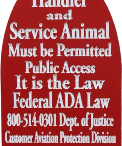 The Handler ID Tag w/Lanyard is red acrylic with white recessed lettering. The lanyard is made with black nylon web. There is a swivel clip for attaching the ID tag. The front of the ID has information to inform others that you require the assistance of a service dog. The back of the ID has the ADA information along with the phone number.