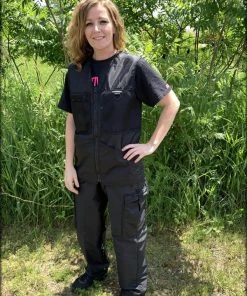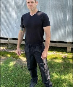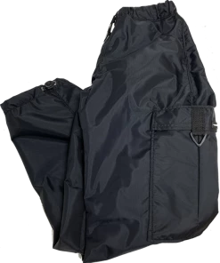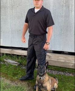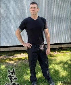 The ActiveDogs handler training pants are cargo style pants with added features. The Handler Training Pants are made of soft durable wind and water-resistant nylon fabric. All the pants seams are double stitched seams for long wearing durability. The elastic self-adjusting waist band makes the pants easy to put on. The waistband is comfortable and has the added feature of a tie able draw cord. The leg bottoms have an elasticized cord lock so the bottom of the legs can be tightened around your ankle and bloused. This is such a great feature making it fast and easy to get your pant leg into your boots when tracking in that wet morning grass. The trouser pockets in front are reinforced deep pockets and the right-side pocket has with a special little inside pocket for cards. On the side of pant legs, there are large expanding cargo pockets. Features of the cargo pockets are hook and loop closing top flaps with easy grab plastic triangles. These open triangles can also be used to attach a pull tab. The right cargo pocket has a side zipper. This works well to put your phone in as it will not fall out when running. The left cargo pocket has an open top back pocket. This is where you can put your tracking or training remote for quick access. In the center of the back of the pants there is a D-ring. This is an excellent feature to hang the ball or tug away from the dog during training. The Activedogs Handler Training Pants come in five sizes. MADE In The USA