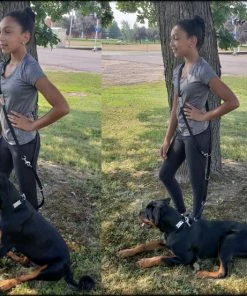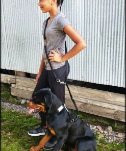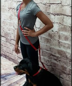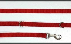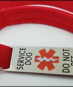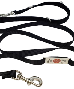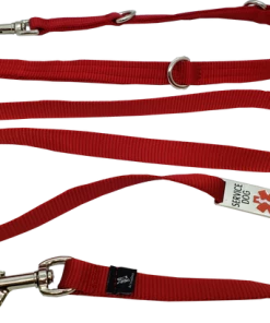 The purpose of this Service Dog Hands Free Chrome Tag Leash is to have the dog work with you and adapt to your body movements. It is made of ¾” wide nylon and has an attached high quality engraved Chrome identification tag. This is a well-made leash with sturdy all metal hardware. The chrome tag identifies a working service dog. The top of the tag has engraved text that says “Service Dog”, and on the lower part of the tag the text reads “Do Not Pet”. When using a hands free leash the dog learns to be attached to you and anticipate what you are doing and the direction it should move with you. I have used and trained with this style leash for many years and have found it to be the fastest way to teach a dog to stay with what I am doing and work with me. This is the leash I always use to take a dog out in public. It is so functional and versatile I would not be without it. One of the benefits of this leash is that it gives you free movement of both your hands. You can work attached to the dog and at the same time move independently from the dog. It is much easier to push a shopping cart, open doors, or pick up objects when you have both hands free. When you are using this lead you will direct the dog with your legs and body movements as much as touching the leash. The lead rests across your shoulder and wraps under your arm and stays close to you so you have quick access to the leash. It is adjustable with different rings that are set into the leash. This is so that the dog can be placed at different lengths away from the handler. And it gives the dog freedom to stop and lay down and rest when the lead is set on the closest snap ring. The length is 7’ long and comes in two color choices, red or black. Matching collars are also available. Made in the USA at activedogs.com