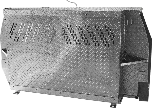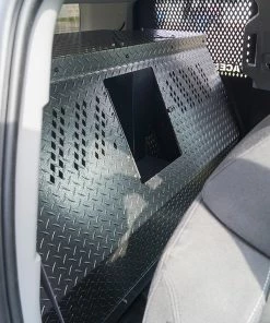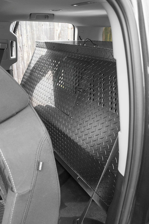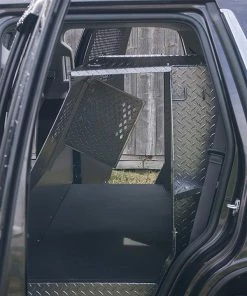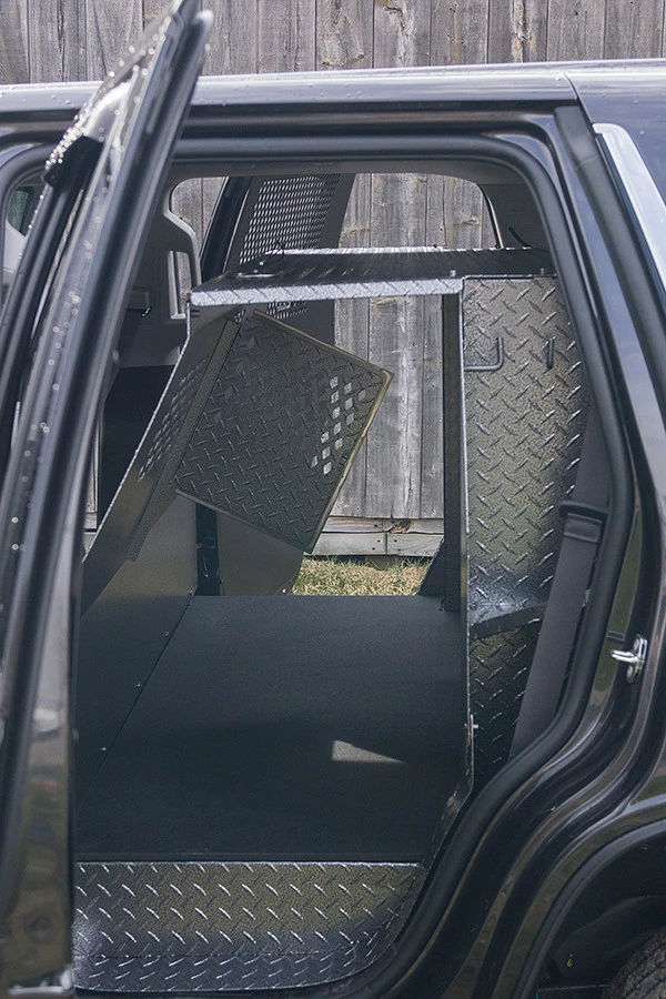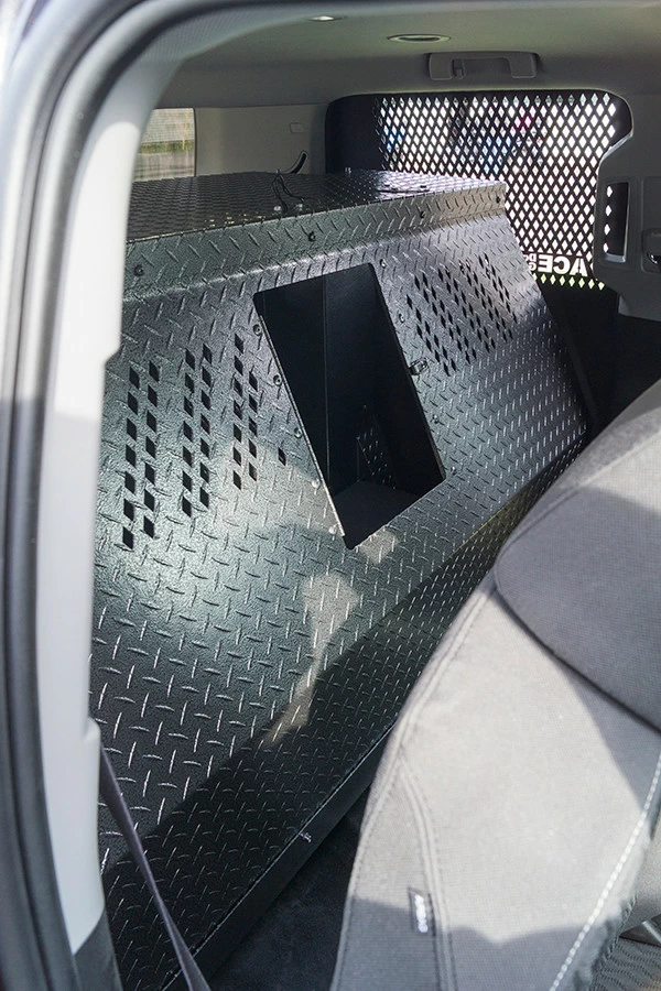 Police K-9 only Vehicle Insert Chevrolet Tahoe 2015 – 2020 is a transport for the K9. The design allows the dog to enter or exit from either side of the vehicle and from the rear. Made from heavy duty diamond-plate aluminum with a durable & beautiful glossy black/silver vein powder coat finish. CNC cut ventilation holes are found on both the front and back panels of the K9 area to allow excellent air-flow, and also let you interact with your K9 partner. There is a (Ventilation Adapter Kit #992063) for attaching the A/C unit, which is sold separately. Comes with rubber floor mat for easy cleaning. Has step for K9 if the K9 gets tired.