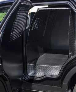 Police K-9/Prisoner Vehicle Insert Ford Interceptor SUV 2013-2016 – K9 and Prisoner transport. The dog can exit out the left or right side of the vehicle. Depending on the option selected. Solid aluminum divider prevents K9 from seeing prisoner. The rear passenger seat of the vehicle is not used and is replaced by an all aluminum prisoner seat for easy cleaning. The Ford Interceptor version is made with a rounded entry way and a step for the canine. There is a (Ventilation Adapter Kit #992063) for attaching the A/C unit, which is sold separately. Holes are cut in the aluminum for mounting a remote release door popping system. This also comes with front and rear ventilation for extra air flow.