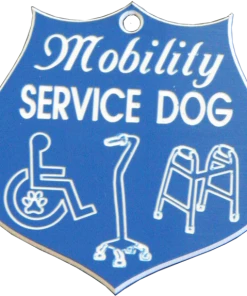 The Mobility Service Dog Tag is made from blue acrylic and is engraved on both sides with white, recessed lettering. The front of the tag says “Mobility Service Dog” along with three graphics.