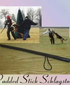 Padded Stick “Schlagstock.” This is the traditional padded stick that is used in Schutzhund/trials. The word “Schlagstock” is German for the word Baton. The Schlagstock is used in protection dog training. The dog is taught courage for when someone comes at them with a object. This stick has a flexible padded core. The extreior is made of man made faux suede. It is not a hard hit on the dog because of the padding. It measures 24″ in length and is 1.5″ wide with a leather suede handle to wrap around your wrist. The leather wrist wrap helps to keep the stick in position while using. The 1.5″ width makes for a comfortable grab and the faux suede is non-slippery. Made in the USA.