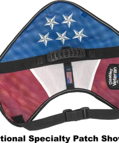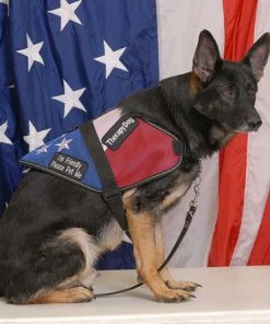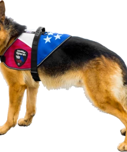We designed this vest to honor our American veterans. It is so beautiful and colorful that we have been asked to add it to our product line. It is made from the same high quality materials that we use in all our working dog vests. This vest has multiple layers of heavy duty mesh for maximum airflow and durability. It has been designed in a red, white, and blue color scheme like our American flag colors. The top back portion of the vest has five embroidered stars on it. This vest has a pre-molded and contoured handle for better grip and comfort. There is a swivel snap for an ID and both the chest and girth straps are adjustable. There is a black metal D-ring on the vest to attach your leash. USA Made