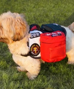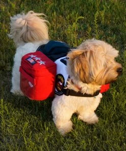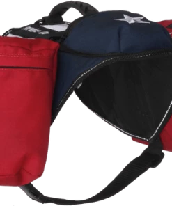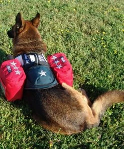 A beautifully embroidered vest-harness with two removable side bags and a petite top pouch. This is a super functional pack carrying dog vest-harness for your working dog. The features are many and the versatility of this Patriotic Tri Pack Vest is multi-functional. You have the look of a highly visible dog vest with the benefit of a harness. This patriotic Tri Pack Vest is done in a Red, White, Blue color scheme with beautifully embroidered silver stars on all three of the packs. The vest is padded for comfort to your dog and both the chest and girth straps are adjustable. Added safety feature of the entire vest outline is done with reflective webbing. Like all of the activedogs.com dog vests it is composed of the highest quality materials having high thread count.