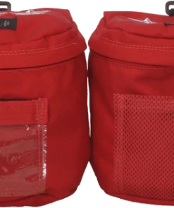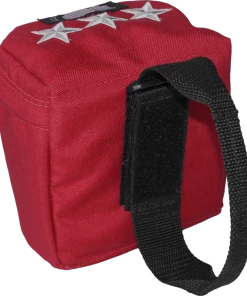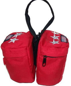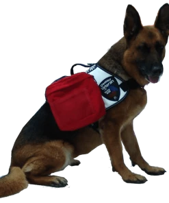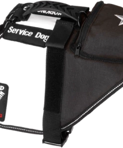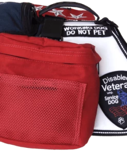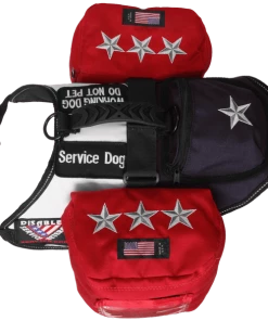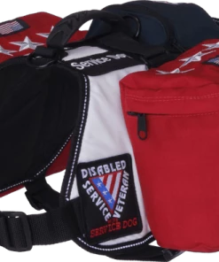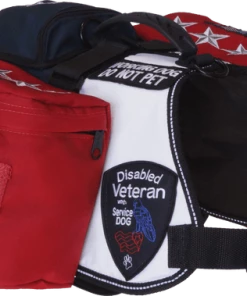 The handle is an easy soft grip molded vinyl handle. In both front and back ends of the handle are attached black strong metal welded D-rings for attaching a leash. There are three packs on this vest. Two beautiful red side packs and one navy blue top pack. The top pack is attached to the dog vest and very handy for small items that can be retrieved quickly, such as pill bottles, keys, etc. The unique side packs can be taken off and carried into the store with a detached web handle. The Patriotic Tri Pack dog Vest comes with the pack handle. These side packs have a three sided full open access zipper along the top edge of the pack. One side pack has an exterior netted pocket that would work well for things that you want at your fingertips such as keys. The other side pack has an exterior clear window, hook and loop closing pocket for your ID. These packs are designed so the dog can still laydown or sit comfortably while wearing the packs on the dog vest. These packs will not flop around the vest as they are attached with a plastic loop ring and commercial hook & loop tape.