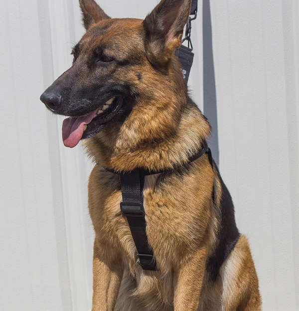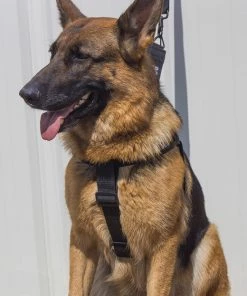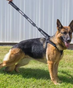 Three words describe this harness & leash: Quick, Secure, Identifying. This harness and leash set are a step in style harness set. It is so quick to put on the dog because you lay the harness open on the floor and the dog steps into the harness and then you simply pull the harness up over the dog’s shoulders and snap it together. It is a secure harness because the harness fits around the dog’s girth, shoulders, and the chest so the dog cannot back out of this harness. The chest strap of this harness is wider for the dog’s comfort which is less stress on the dog. We use this style of harness when we treadmill our dogs for that very reason. And this harness is highly visible identifying your working dog with large text on both the harness and leash.