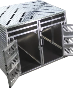 The Aluminum 2 Dog Crate is a versatile and practical transport for your dogs. It allows the ability to travel with either one or two dogs separated. You don’t have to lug around multiple dog crates. If you’ve only got one dog, you can take out the easily removed middle divider and have twice the room for your dog. This is a nice feature for those huge breeds like Saint Benards, Great Danes, Wolfhouds, etc. Just leave the divider in the crate to separate the kennel into two spaces. When doing Search & Rescue work I used to leave the divider in and use the open kennel to store my gear, dog water, and extra supplies. I like the security and safety of this crate when traveling.