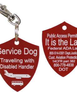 These tags are a must have when traveling with your service dog. The tags are a 2″ across, 2.5″ tall shield style plastic engraved two sided tag that can be used on the dogs collar, harness, or vest. The engraved tag states on one side that this is a service dog traveling with a disabled handler and the other side is the ADA law and Aviation Protection information with phone numbers. This tag comes with a trigger snap clip attached to it for easy application.