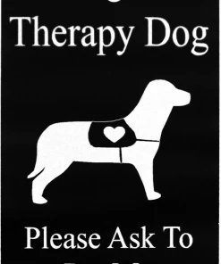 On the front is the text: “Therapy Dog, Please Ask To Pet Me”, along with a graphic of a vested dog. On the back is a statement about what therapy dogs do.