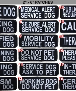 Reflective patches will reflect a light source which will cause them to shine in the dark. The reflective patches add a safety feature to any dog vest, harness, or clothing. Choose from 18 patch text style choices. Choose from three sizes; 1.5″x 3.5″, 2″ x 4″, 2″ x 6″.