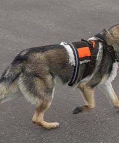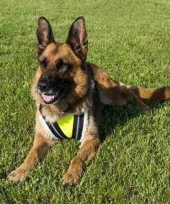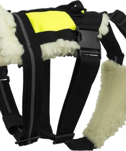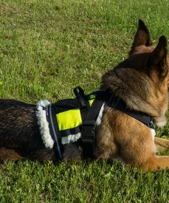 After working in search & rescue with one of my dogs, I realized that there was a need for a double girth harness that was made from the new highly visible yellow/lime fabric. You see this bright fabric used in road construction and nearly all dangerous work situations. In S&R work we wear this new bright yellow/lime color clothing. The S&R Hi Vis Double Girth Harness has several unique features that make it very functional for the working dog. This harness has two girth straps, this is a great feature making the harness more stable on the dog when tracking. The harness has two D-rings one on the neck area of the harness and the other on the back of the harness. When working a long line it can be attached to the back D-ring. This not only gives the dog better free movement but the line tends to tangle less around the dog because it is attached up on the lower part of the dogs back. The chest area has reflective webbing and is padded and lined with Sherpa.