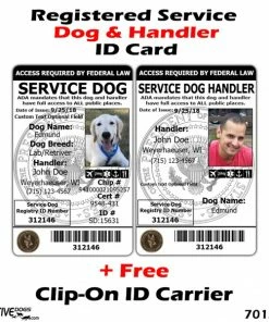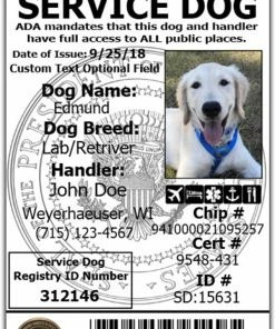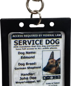 Service Dog IDs will have the ADA (American with Disabilities Act) information on the back of the ID. This information addresses your rights and protects your full access required by law to public buildings.