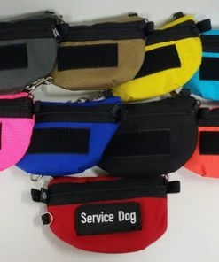The Service Dog Clip-On Small Bag measures 7” wide, 5” long, and can expand 2” at the bottom. This bag has two small bolt snap style clips on the top for attaching the bag. They are very easy to open and close. The bag can also be worn on the handler pants belt loops or clipped to a variety of items such as backpacks, wheelchairs, totes, etc.