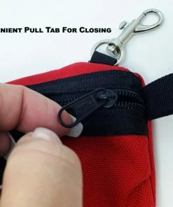 A zipper is located on the bags front top side so it is easy to access. The zipper has a long finger tab for comfortable operation and thumb tabs on both ends of the zipper making opening and closing the bag easy. The Service Dog Clip-On Small Bag comes in 13 colors and is a quality American made product.